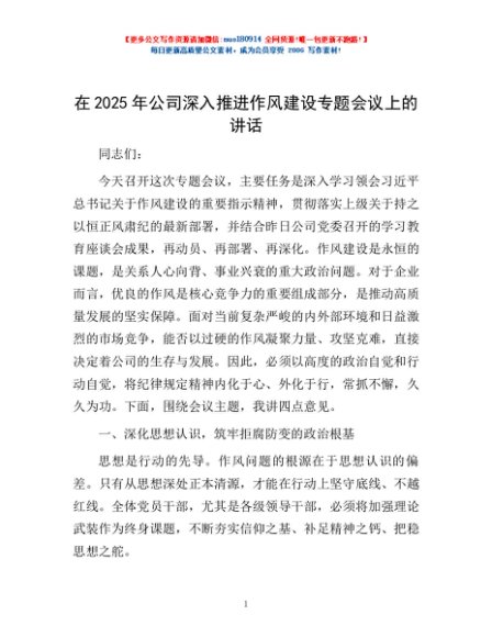 / 在2025年公司深入推进作风建设专题会议上的讲话
