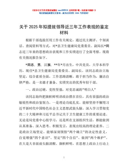 / 关于2025年拟提拔领导近三年工作表现的鉴定材料