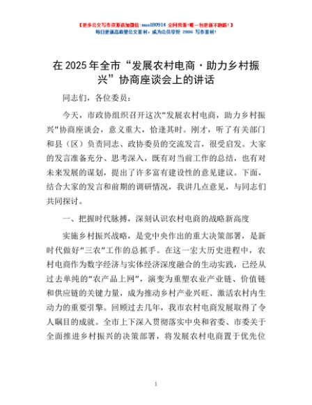 / 在2025年全市“发展农村电商·助力乡村振兴”协商座谈会上的讲话