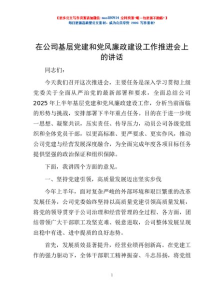 / 在公司基层党建和党风廉政建设工作推进会上的讲话