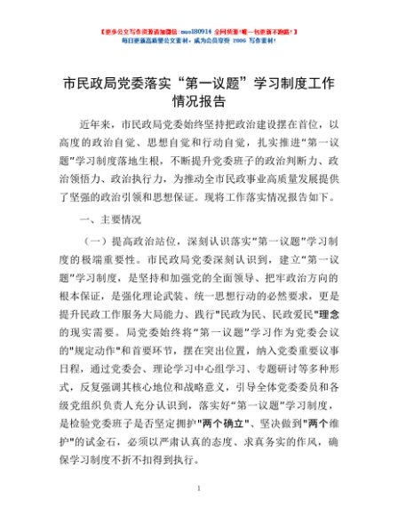 / 市民政局党委落实“第一议题”学习制度工作情况报告