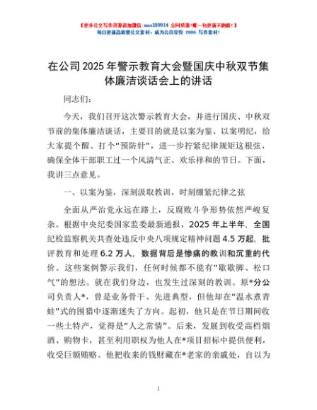 / 在公司2025年警示教育大会暨国庆中秋双节集体廉洁谈话会上的讲话