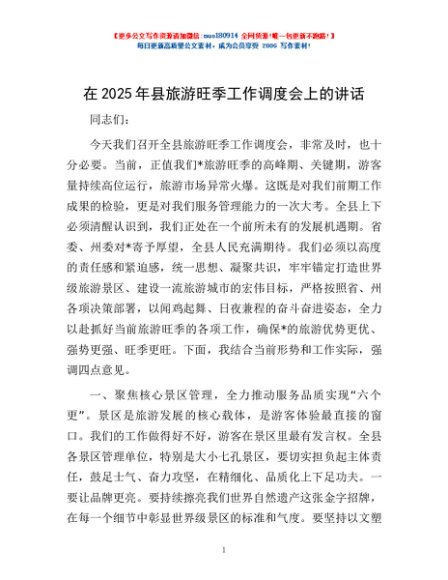 / 在2025年县旅游旺季工作调度会上的讲话