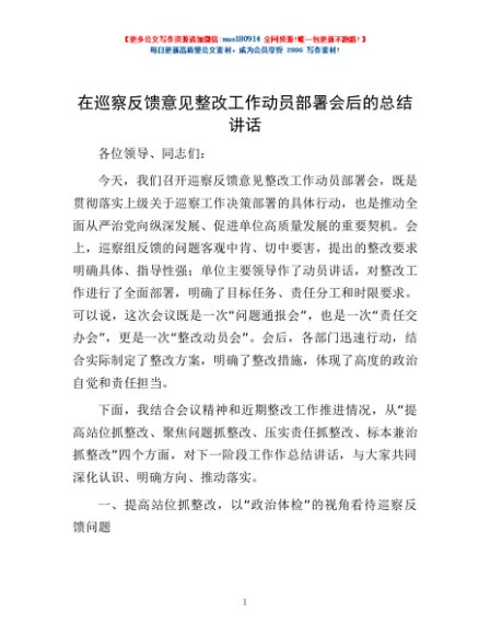 / 在巡察反馈意见整改工作动员部署会后的总结讲话