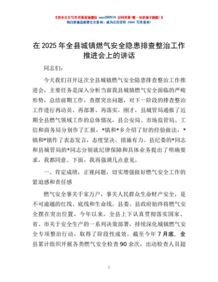 / 在2025年全县城镇燃气安全隐患排查整治工作推进会上的讲话