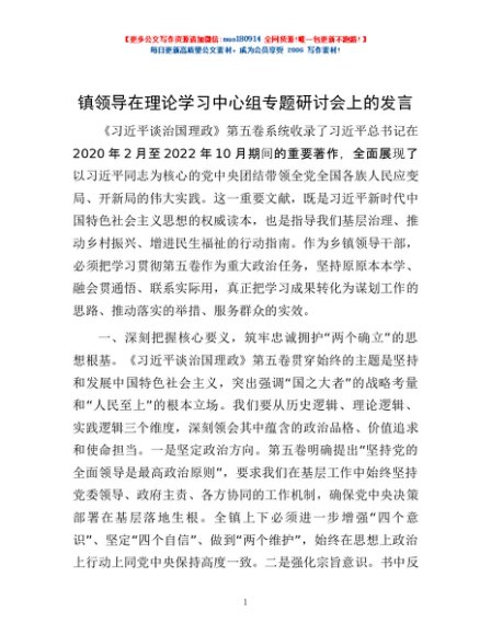 / 镇领导在理论学习中心组专题研讨会上的发言