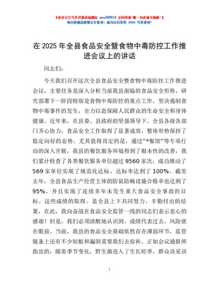 / 在2025年全县食品安全暨食物中毒防控工作推进会议上的讲话