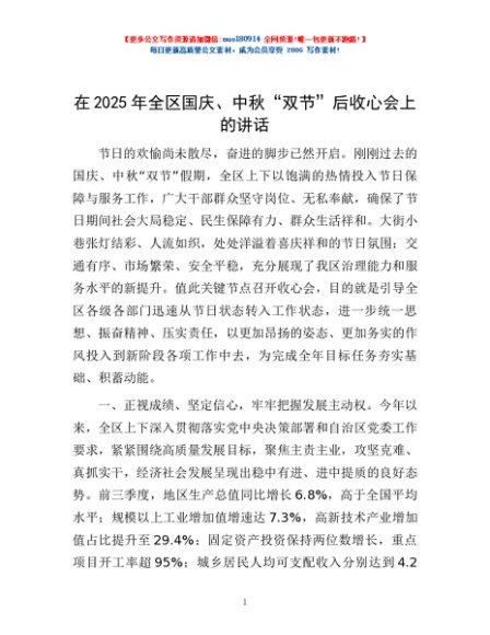 / 在2025年全区国庆、中秋“双节”后收心会上的讲话