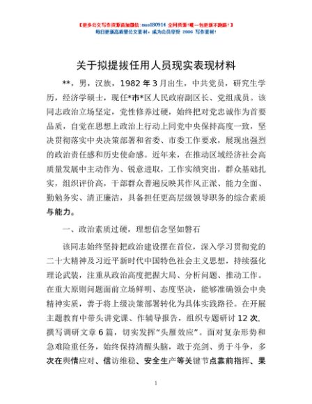 / 关于拟提拔任用人员现实表现材料