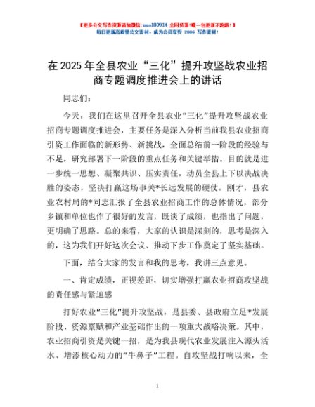 / 在2025年全县农业“三化”提升攻坚战农业招商专题调度推进会上的讲话