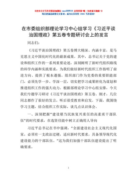 / 在市委组织部理论学习中心组学习《习近平谈治国理政》第五卷专题研讨会上的发言