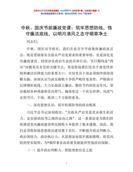 / 中秋、国庆节前廉政党课:筑牢思想防线,恪守廉洁底线,以明月清风之志守烟草净土