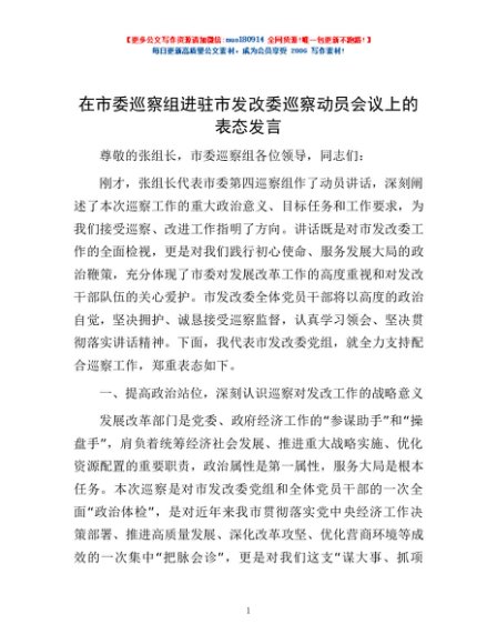 / 在市委巡察组进驻市发改委巡察动员会议上的表态发言