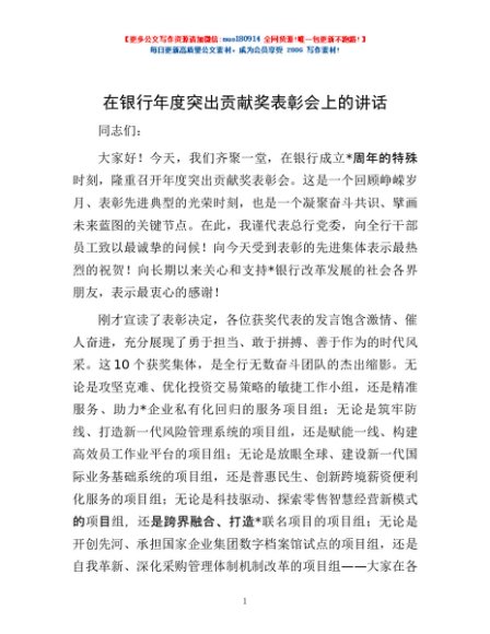 / 在银行年度突出贡献奖表彰会上的讲话