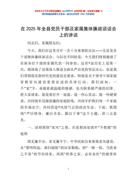 / 在2025年全县党员干部及家属集体廉政谈话会上的讲话