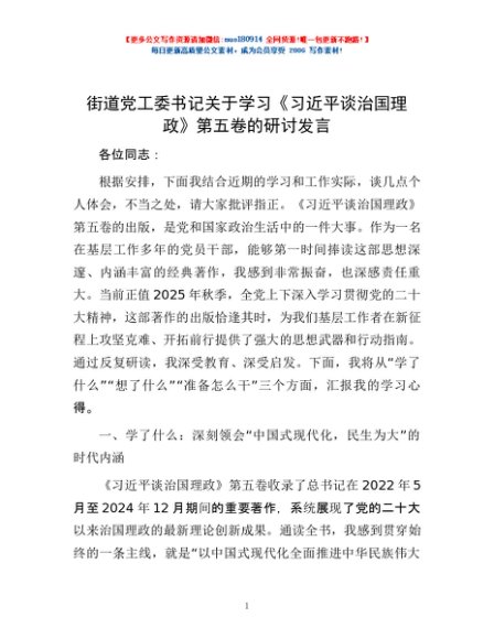 / 街道党工委书记关于学习《习近平谈治国理政》第五卷的研讨发言