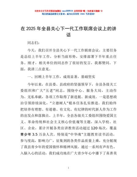 / 在2025年全县关心下一代工作联席会议上的讲话
