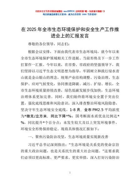 / 在2025年全市生态环境保护和安全生产工作推进会上的汇报发言