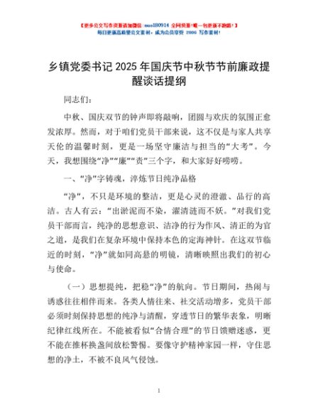 / 乡镇党委书记2025年国庆节中秋节节前廉政提醒谈话提纲