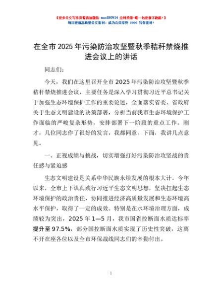 / 在全市2025年污染防治攻坚暨秋季秸秆禁烧推进会议上的讲话