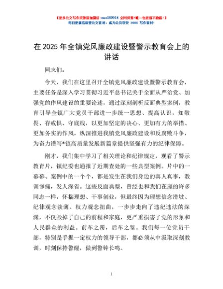 / 在2025年全镇党风廉政建设暨警示教育会上的讲话