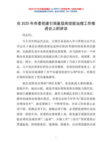 / 在2025年市委党建引领基层高效能治理工作推进会上的讲话