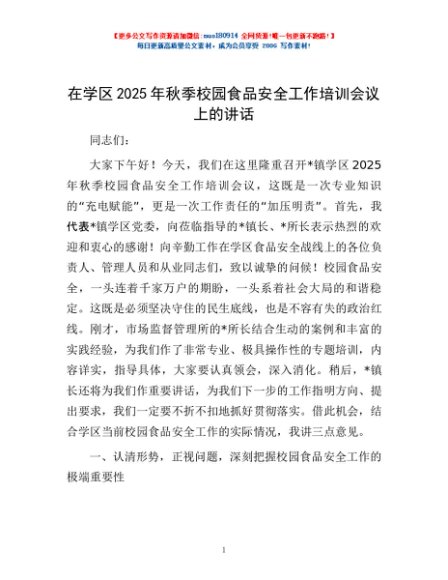 / 在学区2025年秋季校园食品安全工作培训会议上的讲话