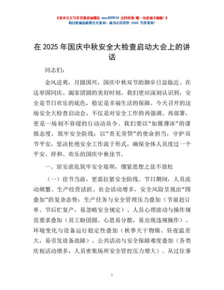 / 在2025年国庆中秋安全大检查启动大会上的讲话