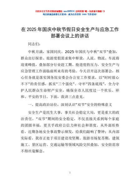 / 在2025年国庆中秋节假日安全生产与应急工作部署会议上的讲话