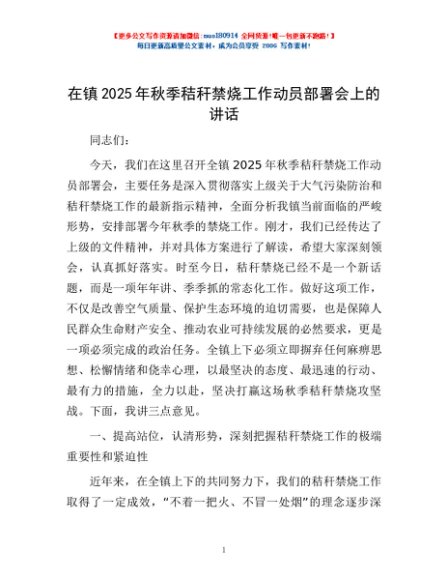 / 在镇2025年秋季秸秆禁烧工作动员部署会上的讲话