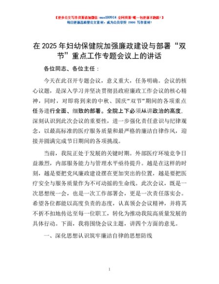 / 在2025年妇幼保健院加强廉政建设与部署“双节”重点工作专题会议上的讲话