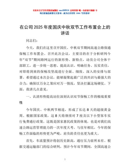 / 在公司2025年度国庆中秋双节工作布置会上的讲话