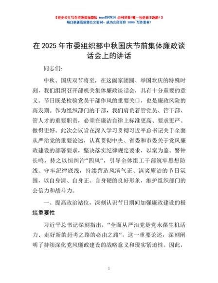 / 在2025年市委组织部中秋国庆节前集体廉政谈话会上的讲话