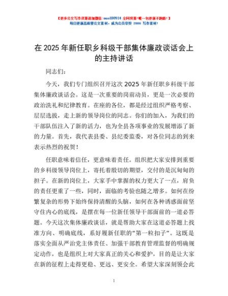 / 在2025年新任职乡科级干部集体廉政谈话会上的主持讲话