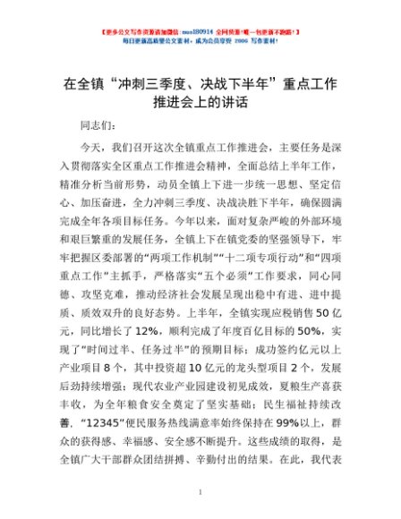 / 在全镇“冲刺三季度、决战下半年”重点工作推进会上的讲话
