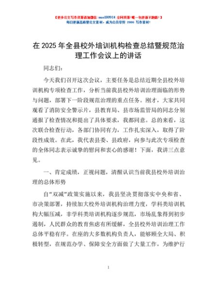 / 在2025年全县校外培训机构检查总结暨规范治理工作会议上的讲话