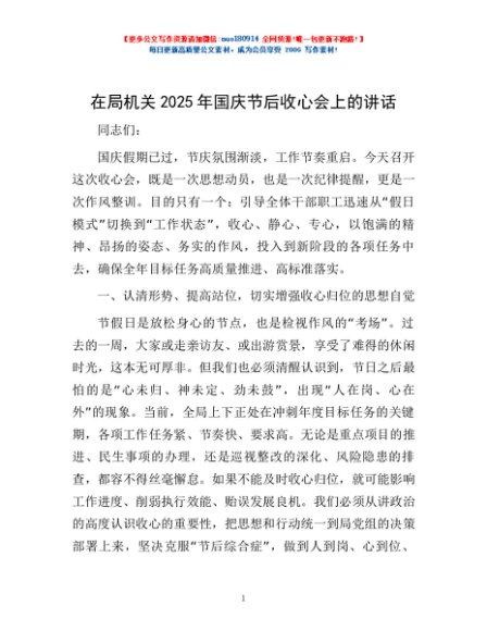 / 在局机关2025年国庆节后收心会上的讲话
