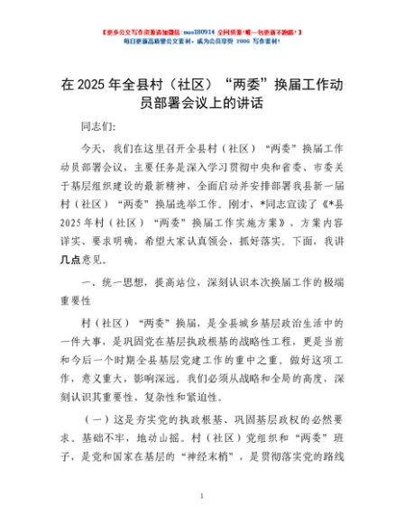 / 在2025年全县村(社区)“两委”换届工作动员部署会议上的讲话