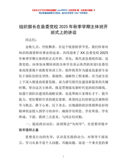 / 组织部长在县委党校2025年秋季学期主体班开班式上的讲话