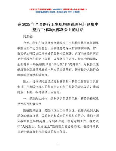 / 在2025年全县医疗卫生机构医德医风问题集中整治工作动员部署会上的讲话