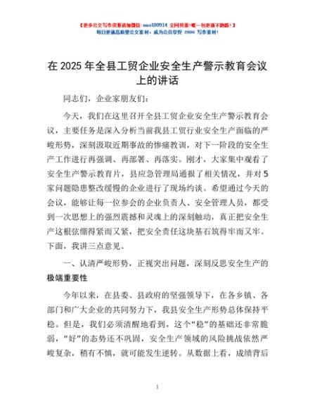 / 在2025年全县工贸企业安全生产警示教育会议上的讲话