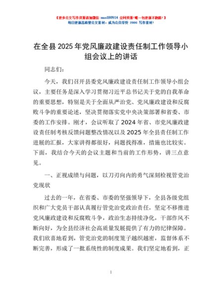 / 在全县2025年党风廉政建设责任制工作领导小组会议上的讲话