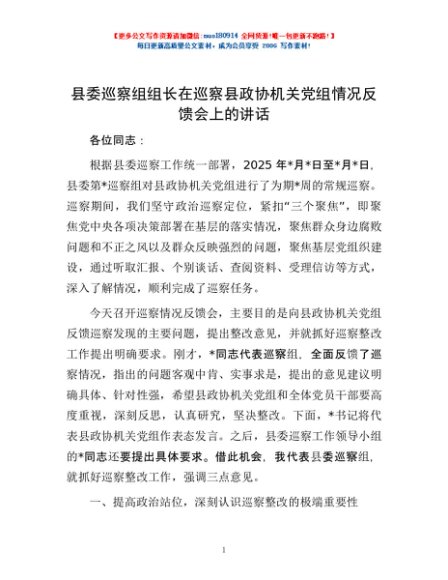 / 县委巡察组组长在巡察县政协机关党组情况反馈会上的讲话