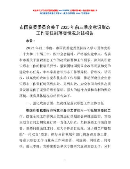 / 市国资委委员会关于2025年前三季度意识形态工作责任制落实情况总结报告