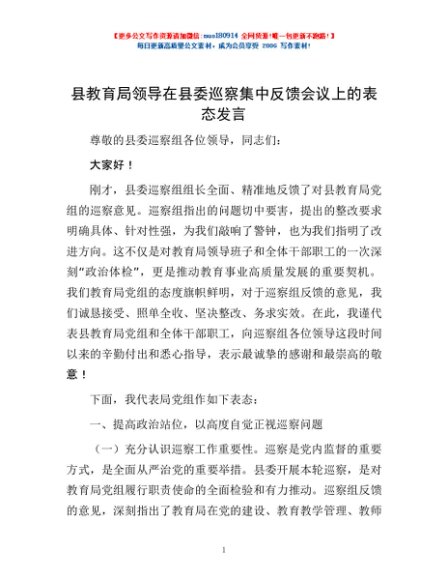 / 县教育局领导在县委巡察集中反馈会议上的表态发言