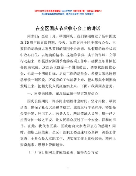 / 在全区国庆节后收心会上的讲话