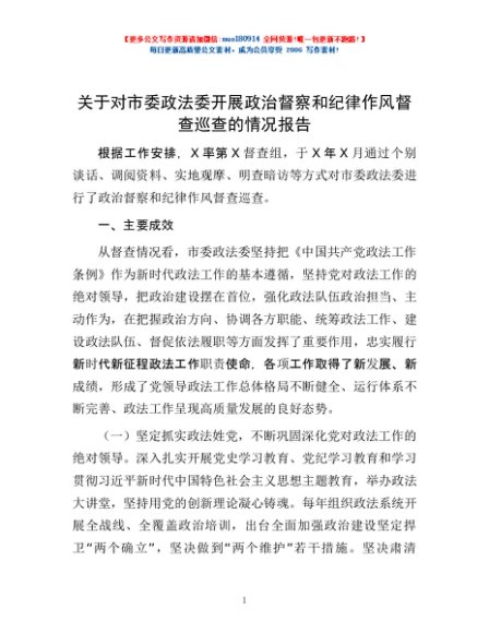 / 关于对市委政法委开展政治督察和纪律作风督查巡查的情况报告