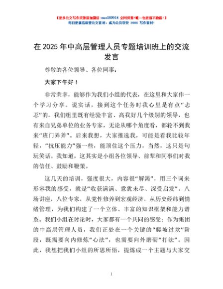 / 在2025年中高层管理人员专题培训班上的交流发言