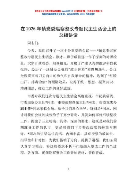 / 在2025年镇党委巡察整改专题民主生活会上的总结讲话