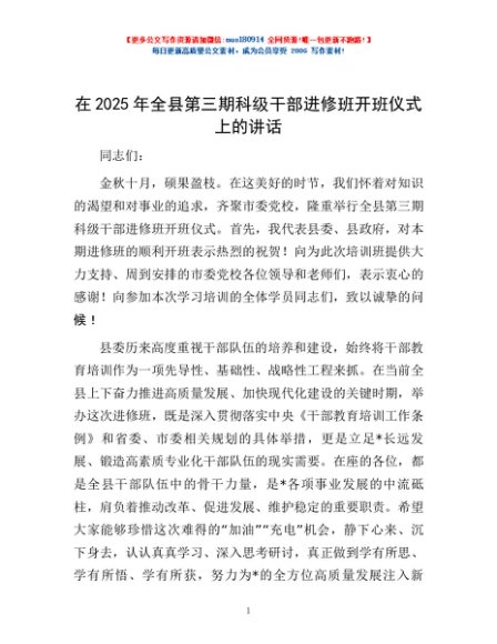 / 在2025年全县第三期科级干部进修班开班仪式上的讲话